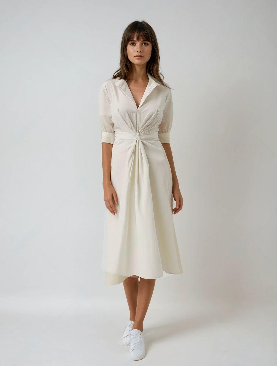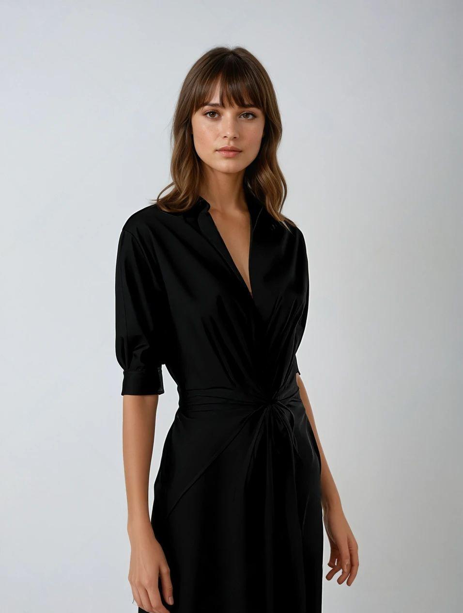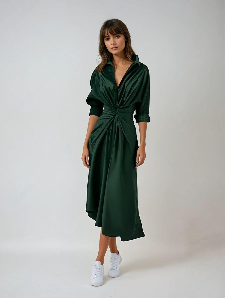 Deze elegante jurk is de perfecte combinatie van stijl en comfort. Het gedrapeerde tailleontwerp accentueert het silhouet op een flatterende manier, terwijl de asymmetrische zoom en opgerolde mouwen zorgen voor een moderne en verfijnde uitstraling. De luxe, satijnachtige stof voegt een subtiele glans toe, waardoor je altijd straalt, of je nu een casual of chique look wilt creëren.